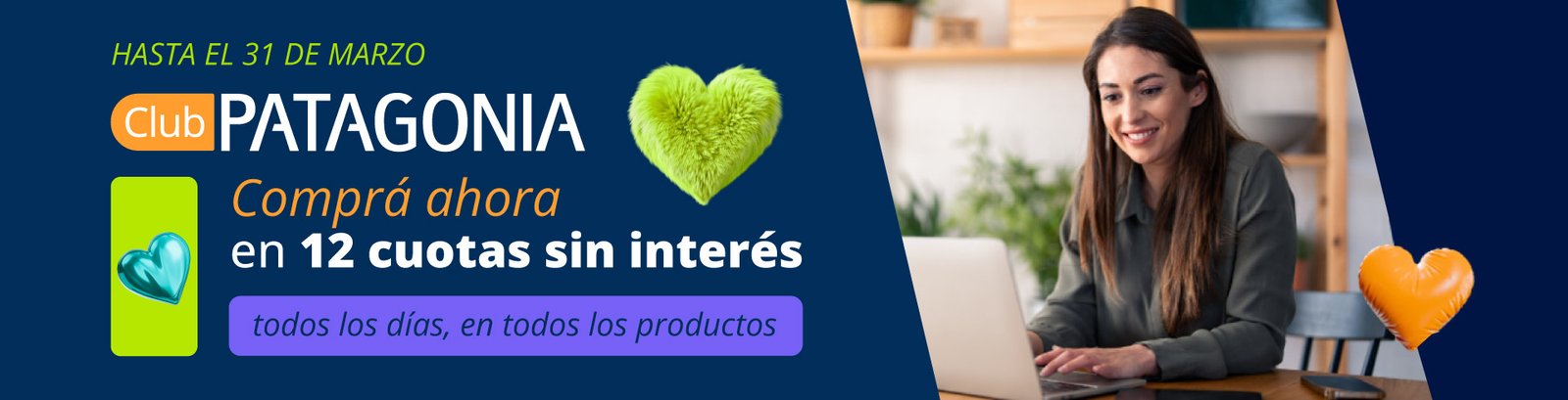 CARTERA DE CONSUMO Y COMERCIAL – PROMOCIÓN VALIDA EN LA REPÚBLICA ARGENTINA DESDE EL 01/01/2026 HASTA EL 01/03/2026, AMBAS FECHAS INCLUÍDAS EXCLUSIVA PARA CLIENTES TITULARES DE LOS PRODUCTOS PATAGONIA CLASICA, PLUS Y SINGULAR, QUIENES RECIBIRÁN UNA FINANCIACIÓN EN HASTA DOCE (12) CUOTAS SIN INTERÉS POR LA/S COMPRA/S QUE REALICEN EN LA TIENDA CLUB PATAGONIA CON TARJETAS DE CRÉDITO VISA, MASTERCARD Y AMERCIAN EXPRESS EMITIDAS POR BANCO PATAGONIA S.A. NO SE RESPONSABILIZA POR LOS CUPONES PRESENTADOS FUERA DE LAS FECHAS DE VIGENCIA DE LAS PROMOCIONES. LAS CUENTAS NO DEBERÁN REGISTRAR MORA. NO APLICA PARA AQUELLOS PAGOS Y/O CONSUMOS ABONADOS CON TARJETAS DE CRÉDITO EMITIDAS POR BANCO PATAGONIA S.A. A TRAVÉS DE BILLETERAS VIRTUALES, POS MÓVILES, PLATAFORMAS DE PAGO Y/O PORTALES DE PAGO ON LINE A EXCEPCION DE MODO, GOOGLE PAY Y APPLE PAY